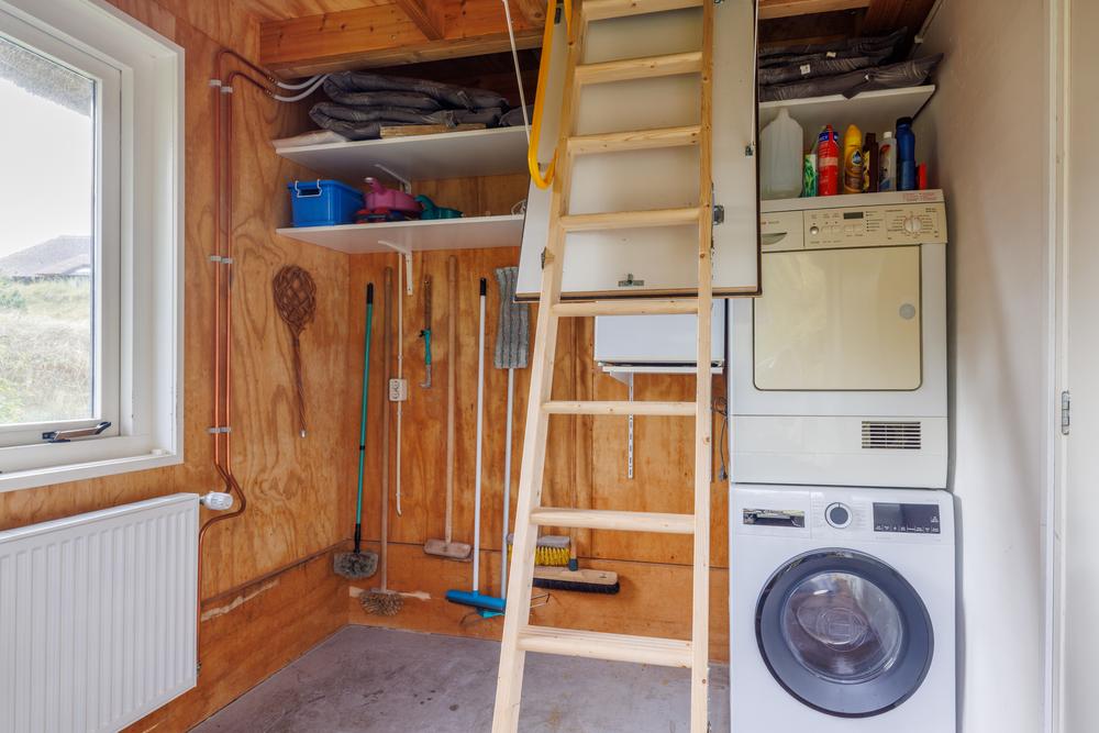 Een stenen/houten berging/ bijkeuken met zolder biedt plek voor fietsen, strandspullen of gereedschap.