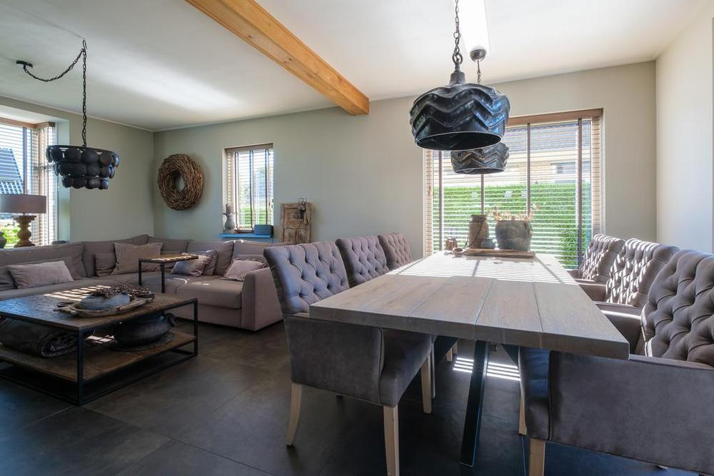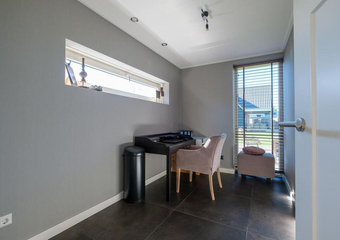 Het perceel beschikt over een diepe voortuin en een lange oprit langs het huis naar de garage. Via de hal kom je in de smaakvol ontworpen keuken. Deze is voorzien van een 5-pits kookplaat met wokpit, combimagnetron en koelkast. Aansluitend is er een sfeervolle plek voor de zit- en eethoek. Hier vind je ook een grote en praktische kastenwand. Woonkamer en keuken zijn samen 45 m² groot. Aan daglicht geen gebrek. De grote erker aan de zijkant van de keuken biedt niet alleen licht in overvloed, maar ook plek aan een leuke zithoek. Achter de keuken is er een tweede hal, die toegang geeft tot een toilet en twee ruimtes: de bijkeuken (6 m²) en een mooie werkkamer van 8 m². Doordat de tweede hal een aparte toegang heeft, is deze werkkamer goed te gebruiken voor een praktijk aan huis of ideale plek voor thuiswerken.
