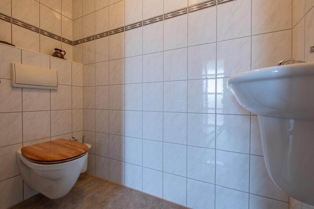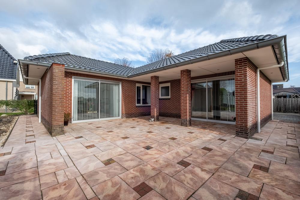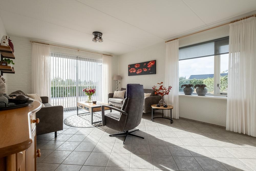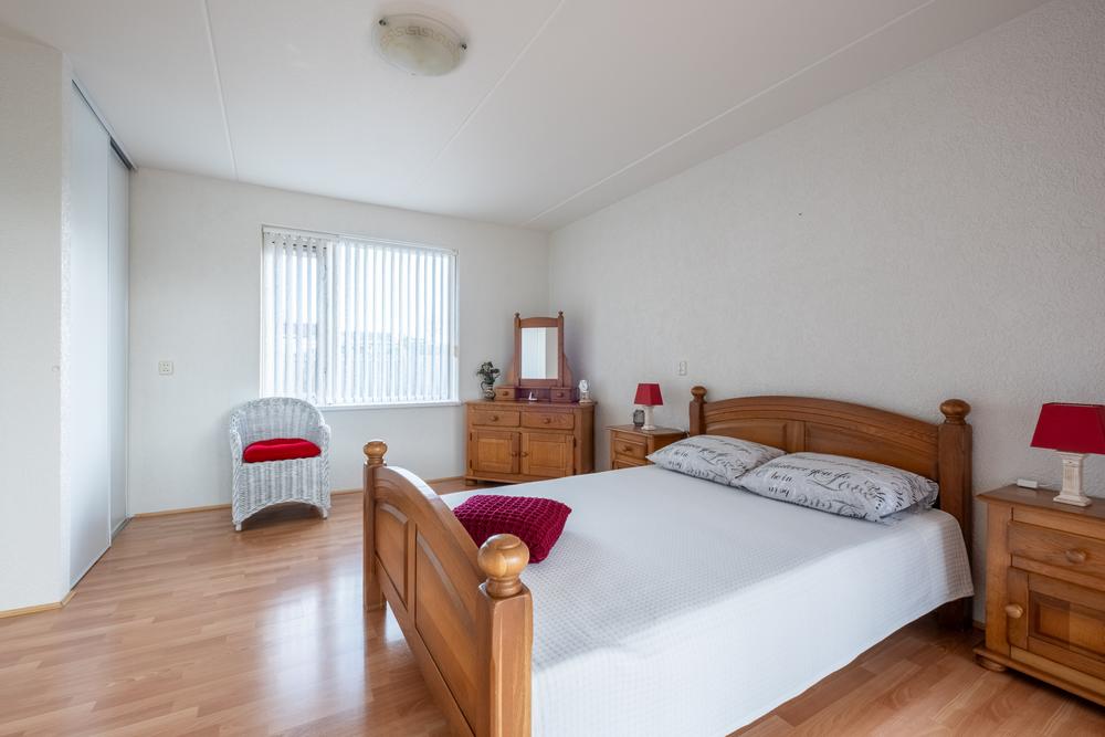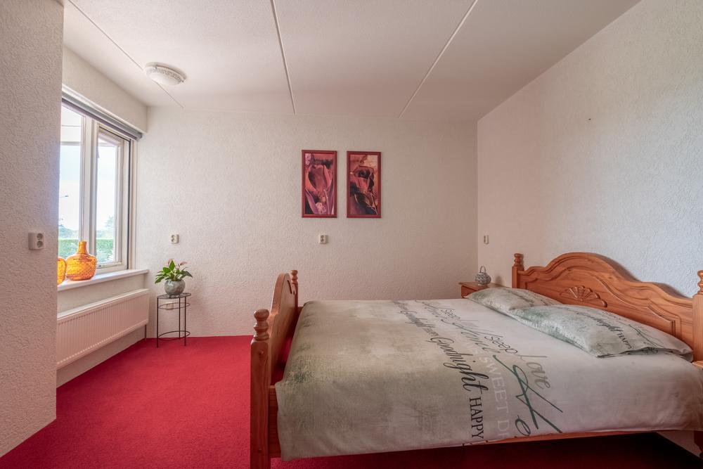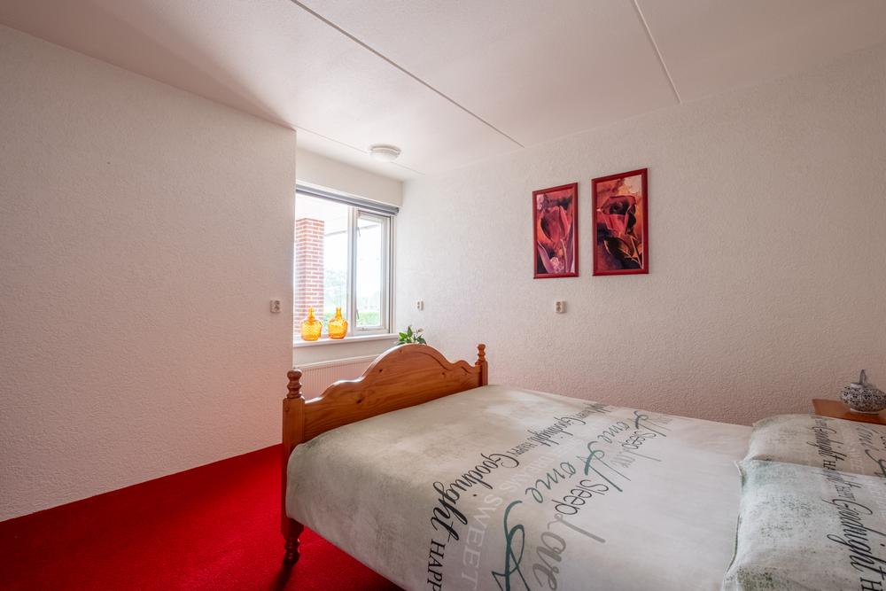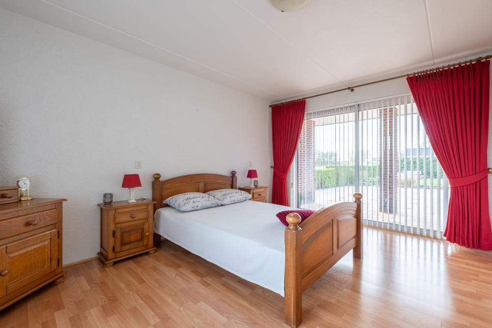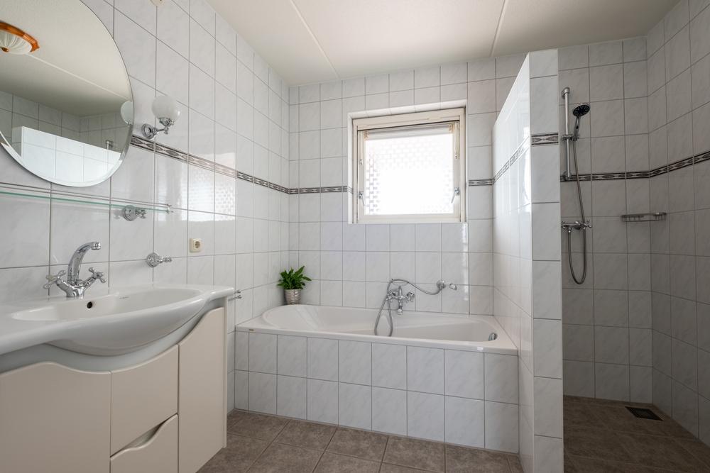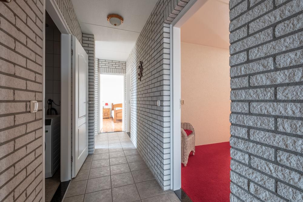 De woning beschikt verder over twee slaapkamers, ieder met toegang tot de overkapping, en een complete badkamer met ligbad, douche en wastafel. De wc is apart toegankelijk vanuit de hal.