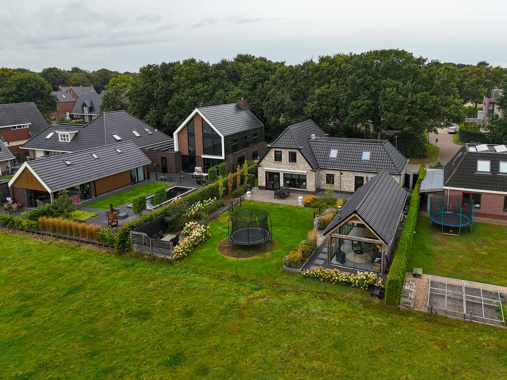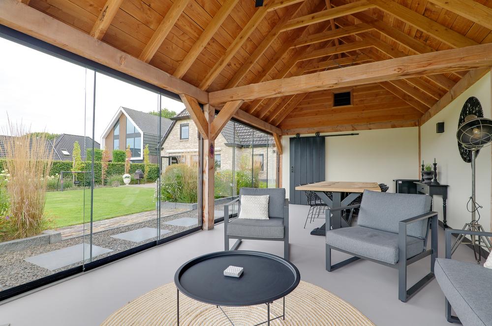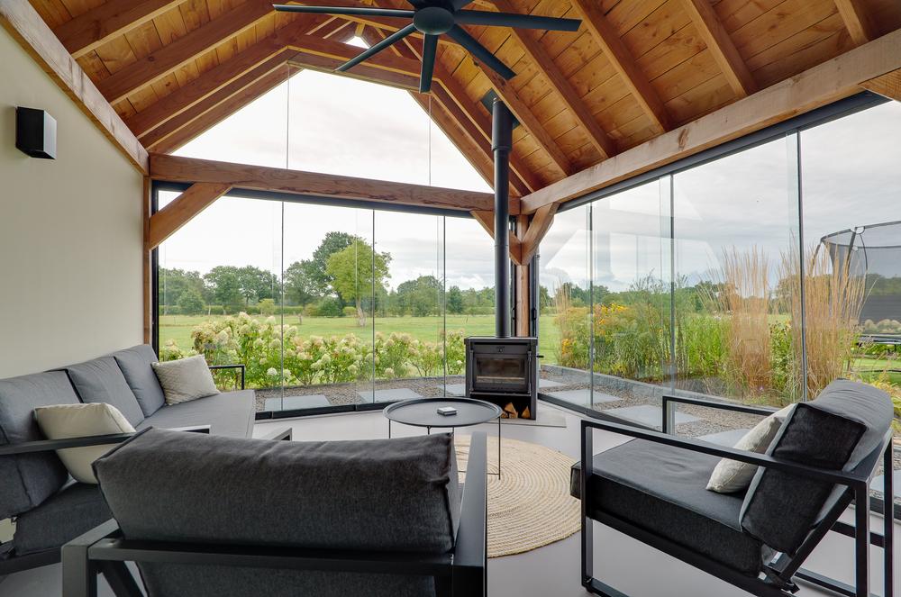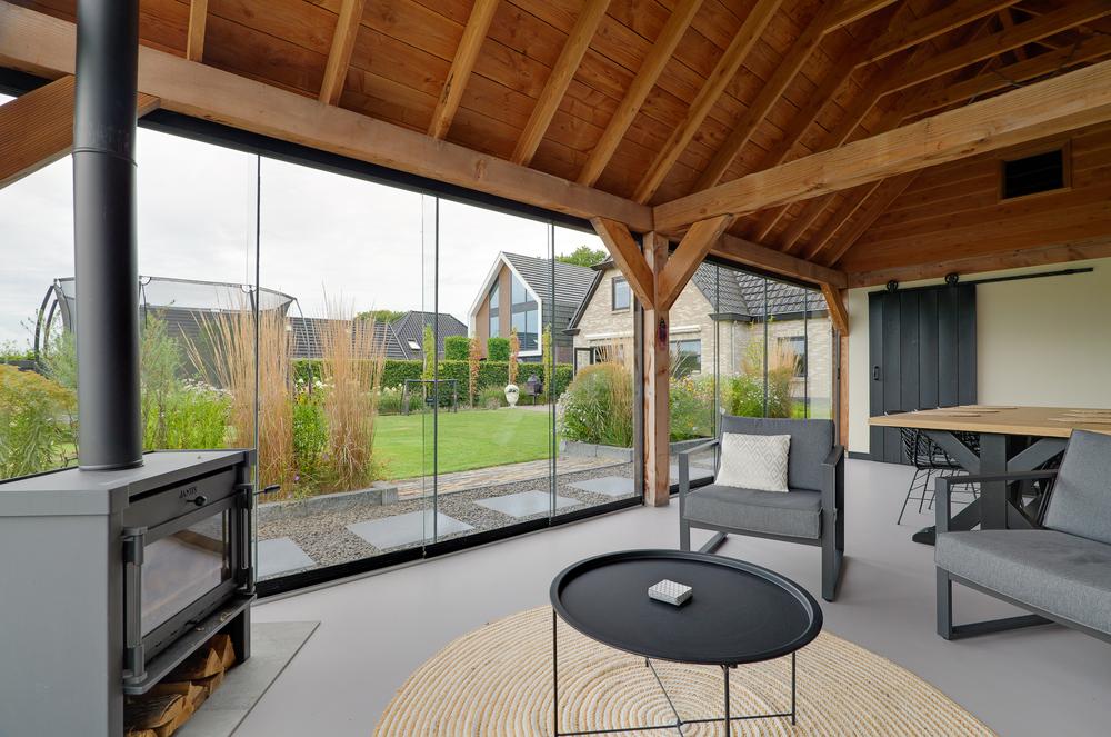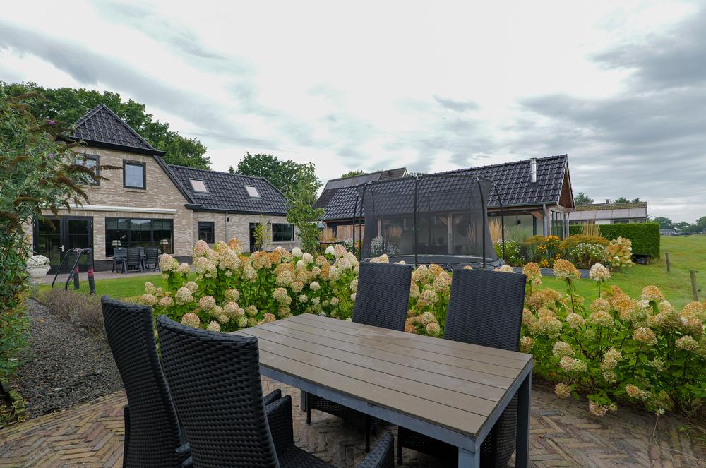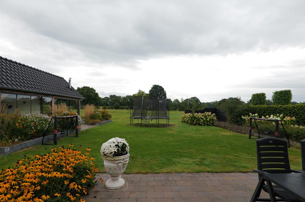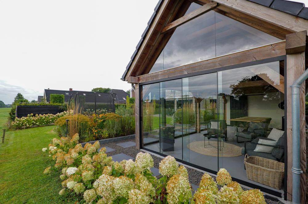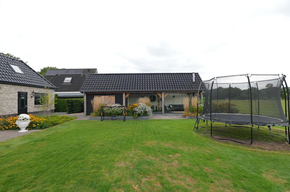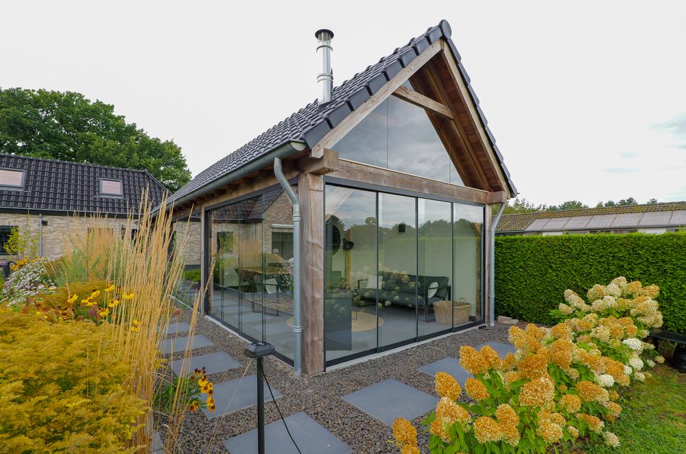 De woning staat op een mooi perceel met een fraai aangelegde tuin rondom, met als eyecatcher een glazen tuinkamer met extra bergruimte aan de achterzijde. Deze stijlvolle ruimte met robuuste houten gebinten biedt een panoramisch uitzicht over de tuin en de weilanden daarachter. Dankzij de glazen wanden zit je hier het hele jaar door heerlijk: beschut, comfortabel en toch midden in het groen. Met de houtkachel aan is het op frissere dagen een warme, sfeervolle plek om te ontspannen, gasten te ontvangen of uitgebreid te tafelen.