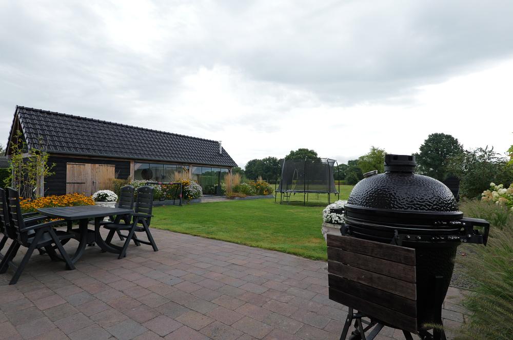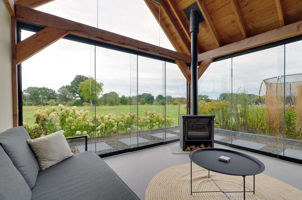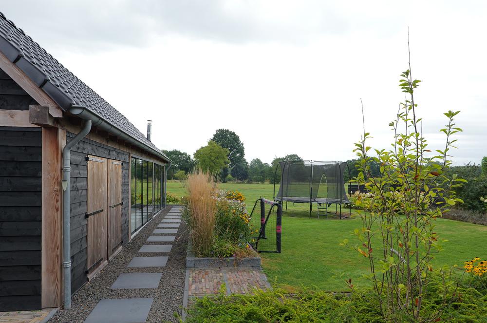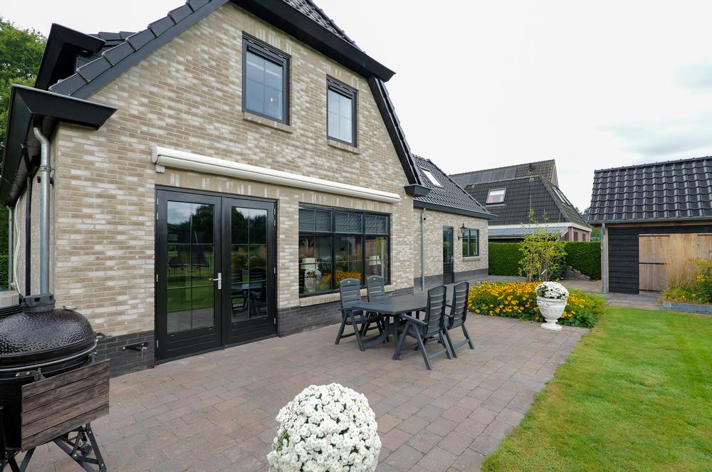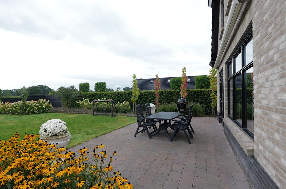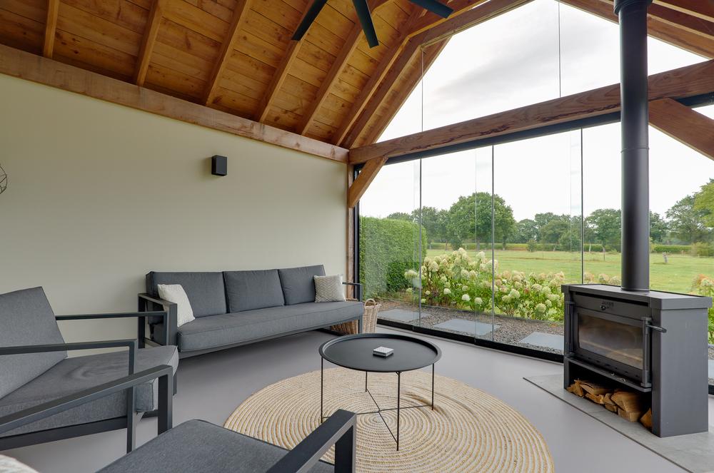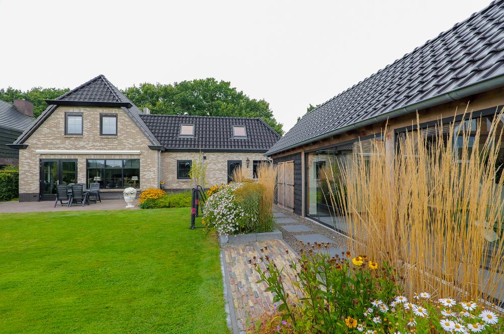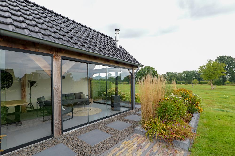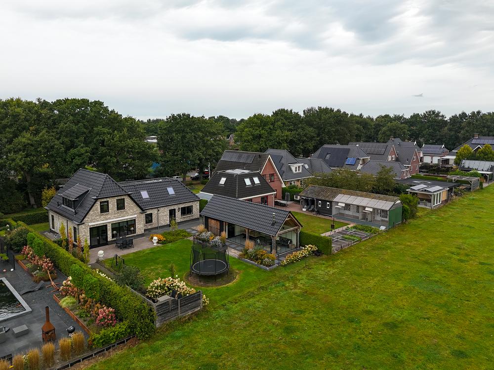 De woning staat op een mooi perceel met een fraai aangelegde tuin rondom, met als eyecatcher een glazen tuinkamer met extra bergruimte aan de achterzijde. Deze stijlvolle ruimte met robuuste houten gebinten biedt een panoramisch uitzicht over de tuin en de weilanden daarachter. Dankzij de glazen wanden zit je hier het hele jaar door heerlijk: beschut, comfortabel en toch midden in het groen. Met de houtkachel aan is het op frissere dagen een warme, sfeervolle plek om te ontspannen, gasten te ontvangen of uitgebreid te tafelen.