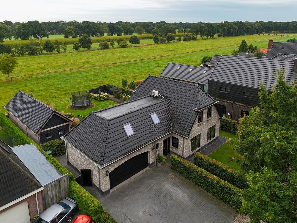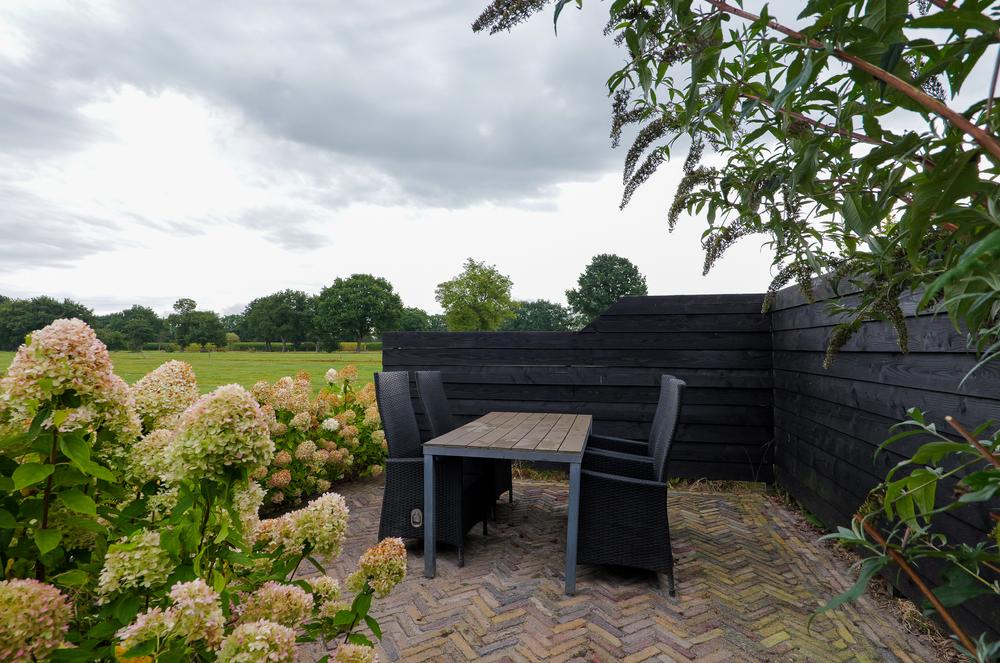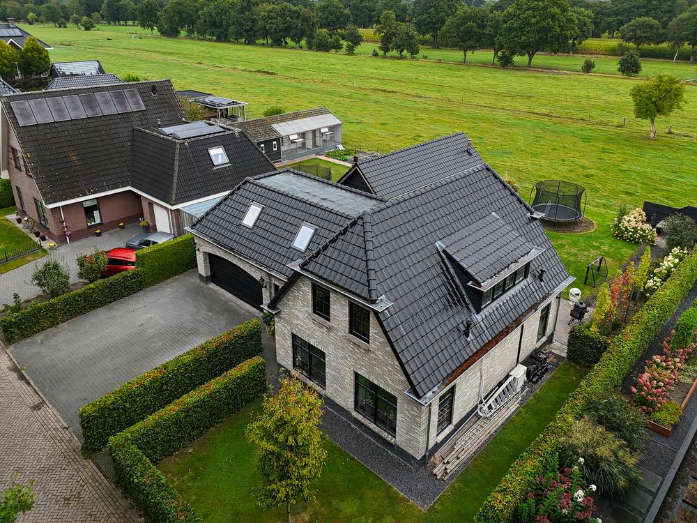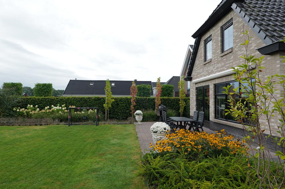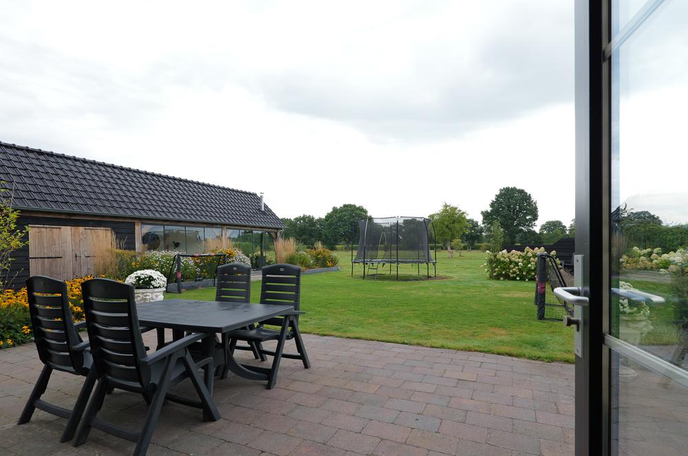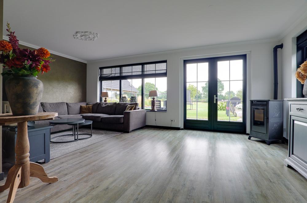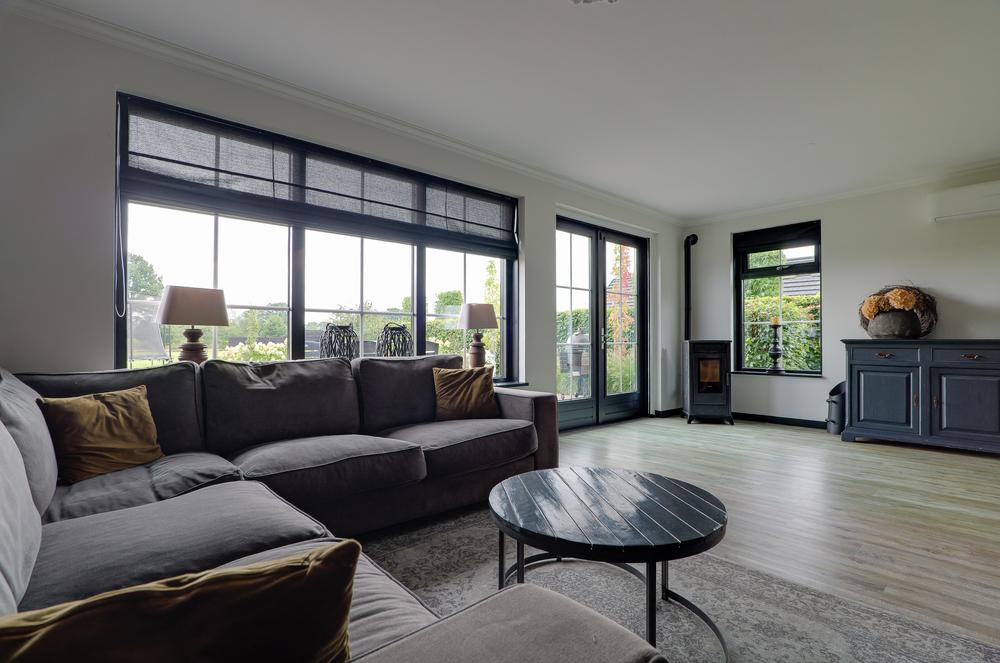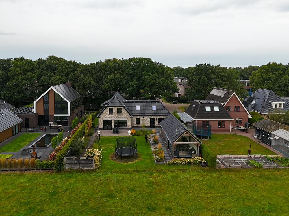 De woning staat op een mooi perceel met een fraai aangelegde tuin rondom, met als eyecatcher een glazen tuinkamer met extra bergruimte aan de achterzijde. Deze stijlvolle ruimte met robuuste houten gebinten biedt een panoramisch uitzicht over de tuin en de weilanden daarachter. Dankzij de glazen wanden zit je hier het hele jaar door heerlijk: beschut, comfortabel en toch midden in het groen. Met de houtkachel aan is het op frissere dagen een warme, sfeervolle plek om te ontspannen, gasten te ontvangen of uitgebreid te tafelen.