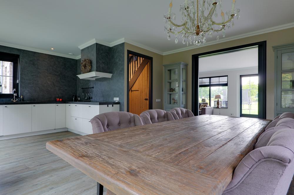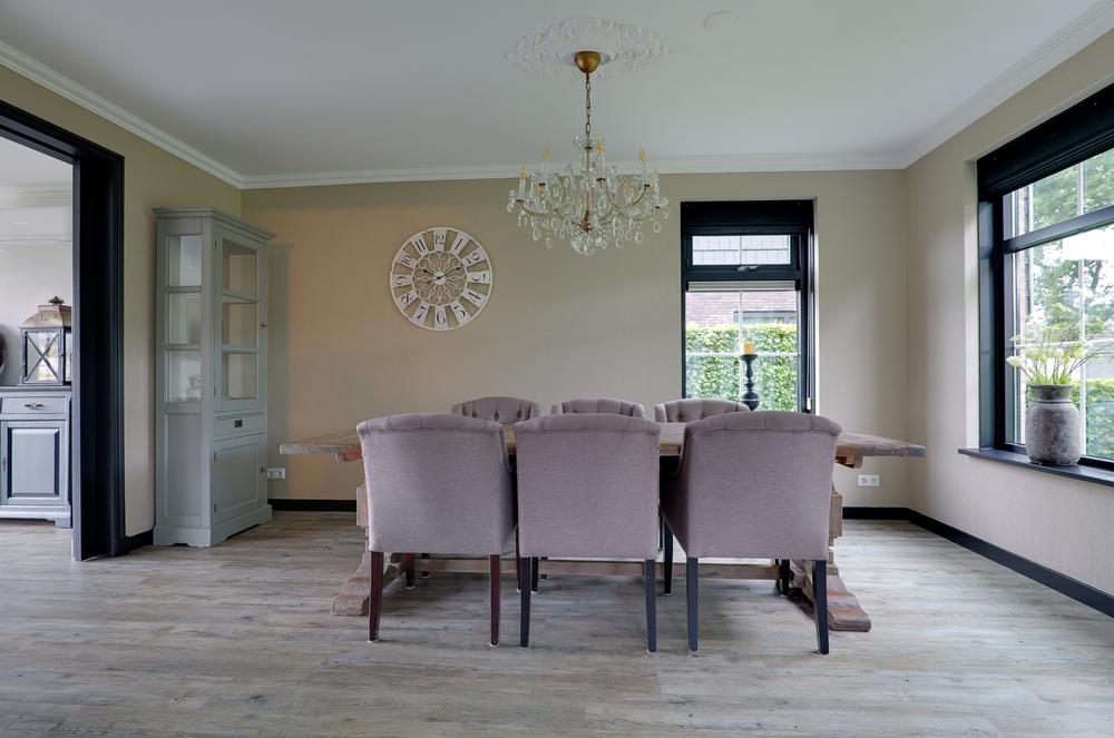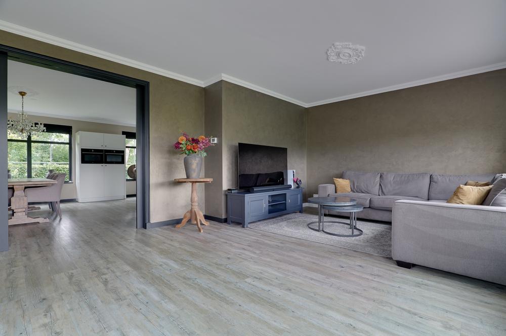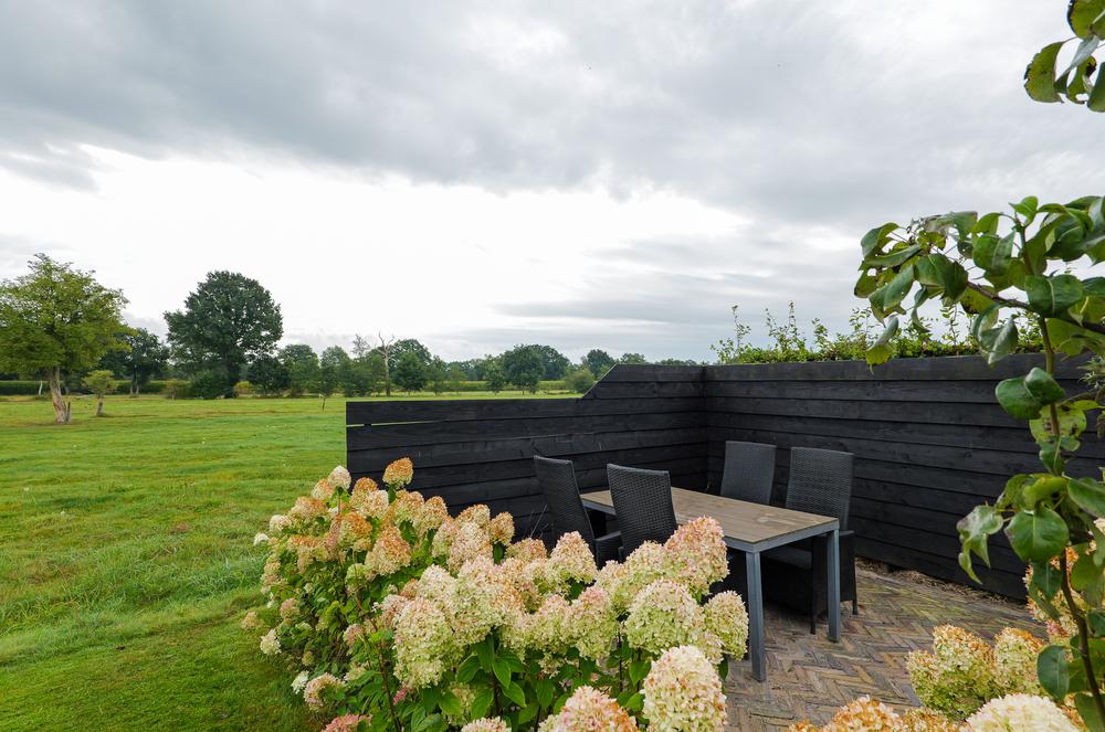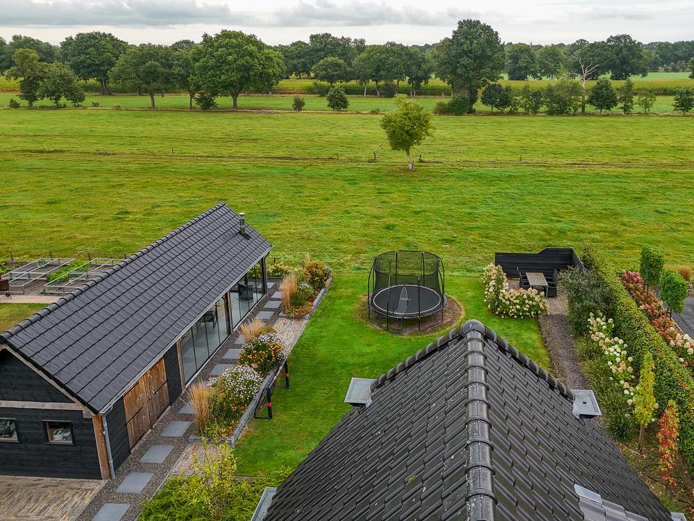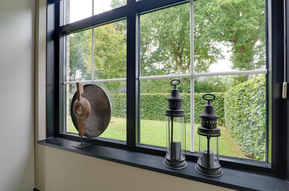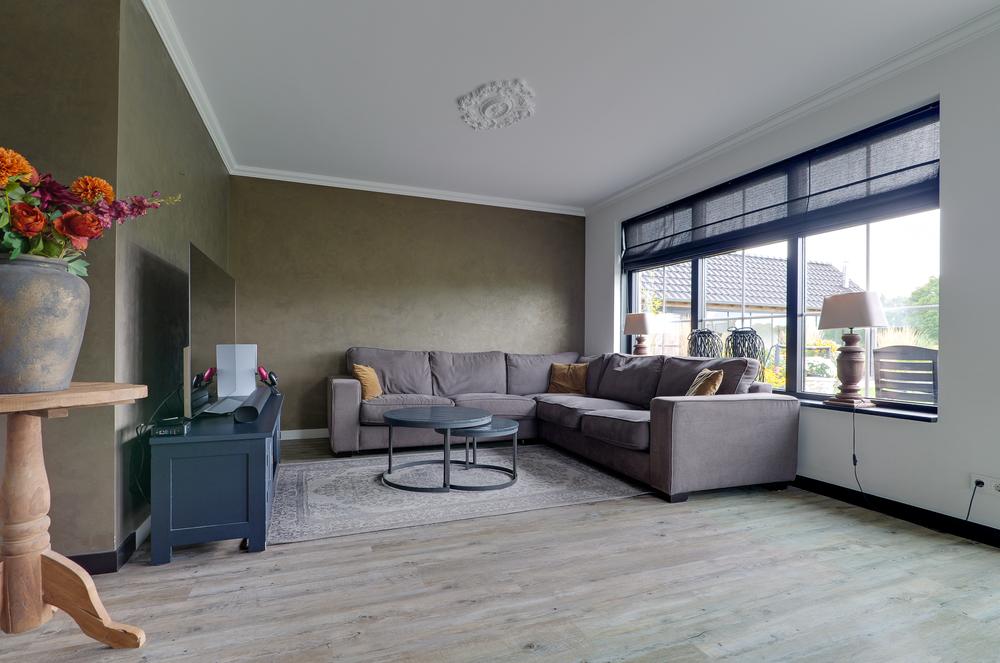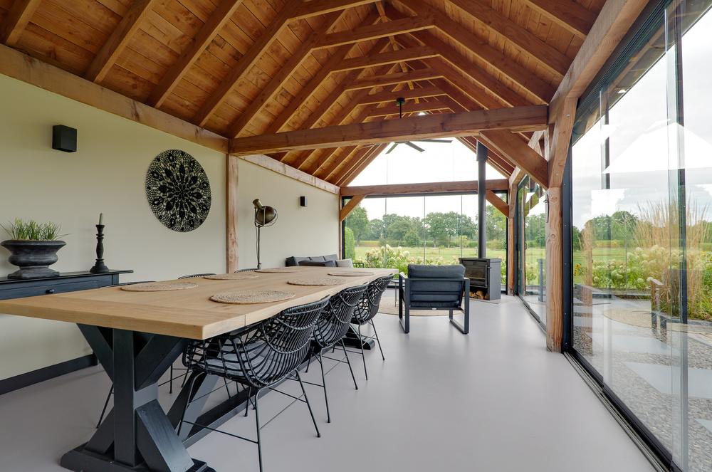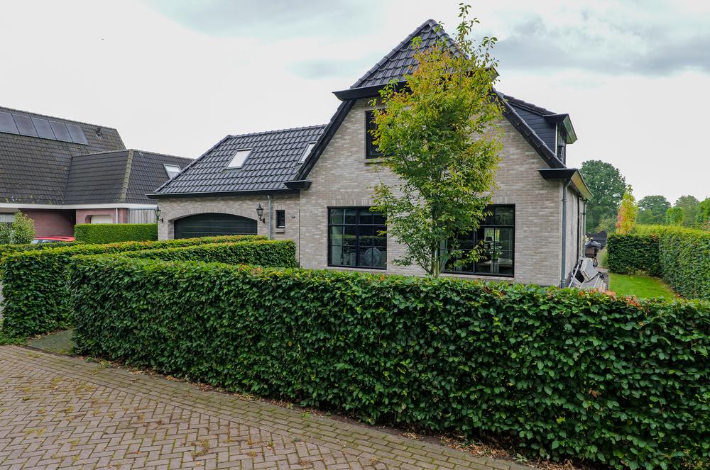 De woning staat op een mooi perceel met een fraai aangelegde tuin rondom, met als eyecatcher een glazen tuinkamer met extra bergruimte aan de achterzijde. Deze stijlvolle ruimte met robuuste houten gebinten biedt een panoramisch uitzicht over de tuin en de weilanden daarachter. Dankzij de glazen wanden zit je hier het hele jaar door heerlijk: beschut, comfortabel en toch midden in het groen. Met de houtkachel aan is het op frissere dagen een warme, sfeervolle plek om te ontspannen, gasten te ontvangen of uitgebreid te tafelen.