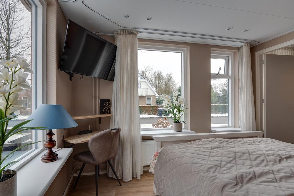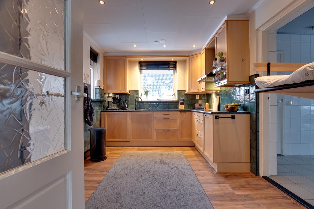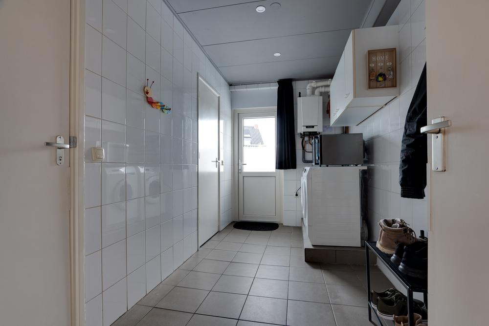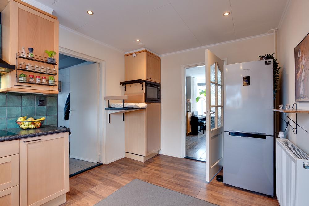 Via de voordeur biedt de entree toegang tot de meterkast en de trapopgang. De hal erachter leidt naar de slaapkamer aan de voorzijde van de woning en voert daarna door naar de gezellige woonkamer. Een fijne ruimte waar je makkelijk thuiskomt na een werkdag en waar genoeg plek is voor een grote eettafel en een ruime zithoek. De keuken sluit hier mooi op aan en is praktisch ingericht met onder meer een vaatwasser, inductiekookplaat, afzuigkap en een fraai betegelde achterwand. Doordat de keuken in een uitbouw is gerealiseerd zijn er aan de voor- en zijkant ramen aanwezig wat de ruimte prettig licht maakt. Naast de keuken bevindt zich een ruime bijkeuken met voldoende plek voor het witgoed en toegang tot het toilet en de naastgelegen badkamer met wastafel en douchehoek. Op de begane grond bevindt zich bovendien een slaapkamer van 10 m². Dat maakt de woning niet alleen comfortabel, maar ook toekomstgericht. Nu flexibel in te zetten als werk- of logeerkamer, later ideaal wanneer gelijkvloers wonen belangrijker wordt.
