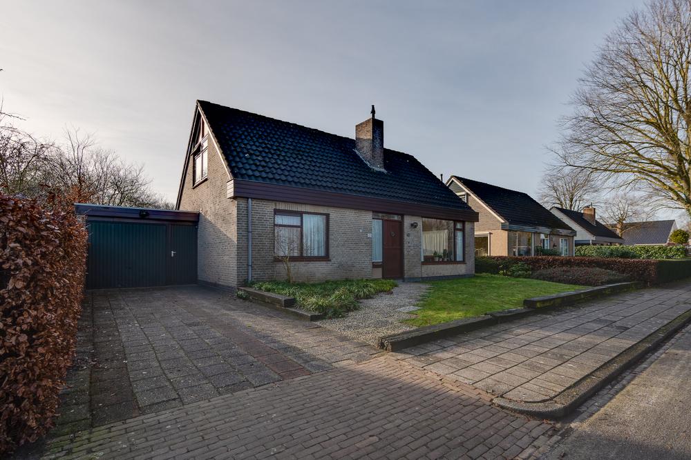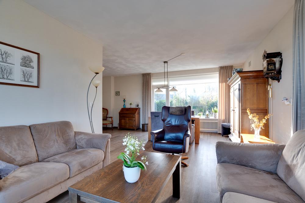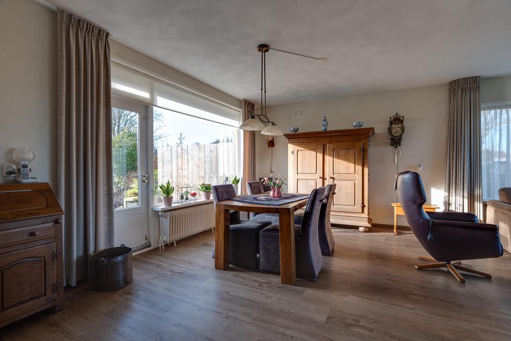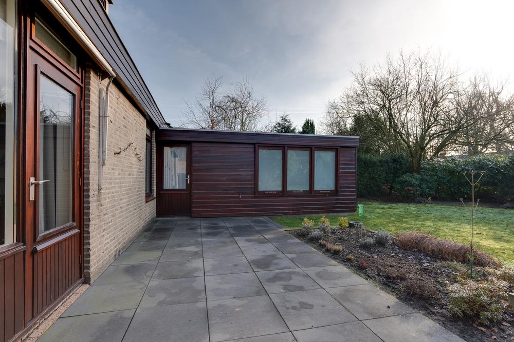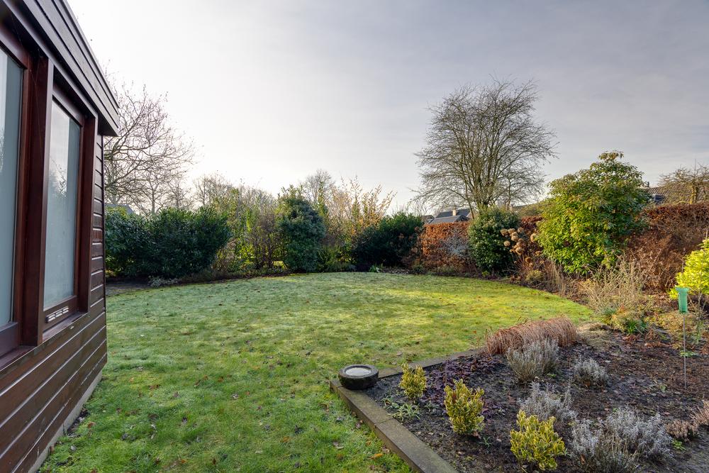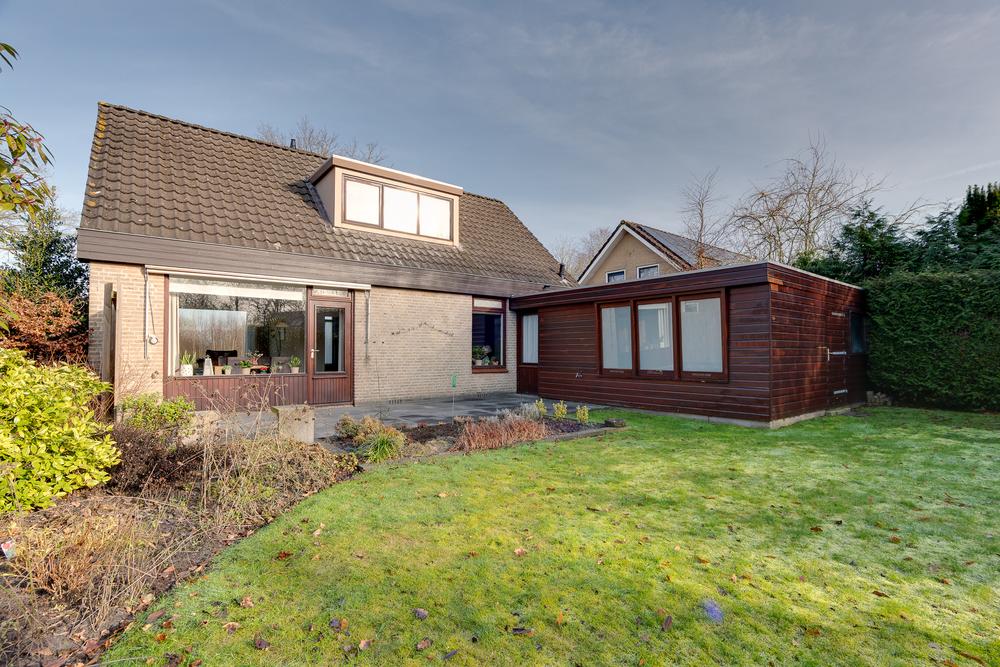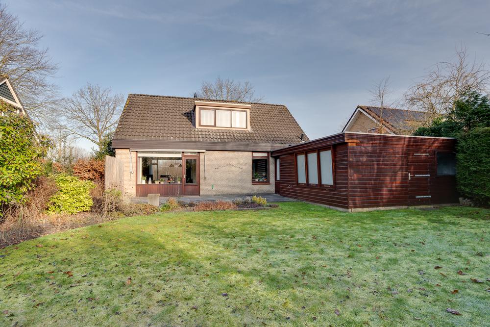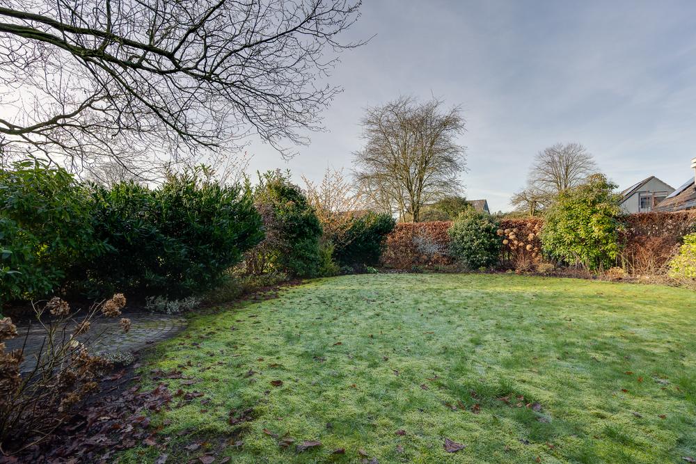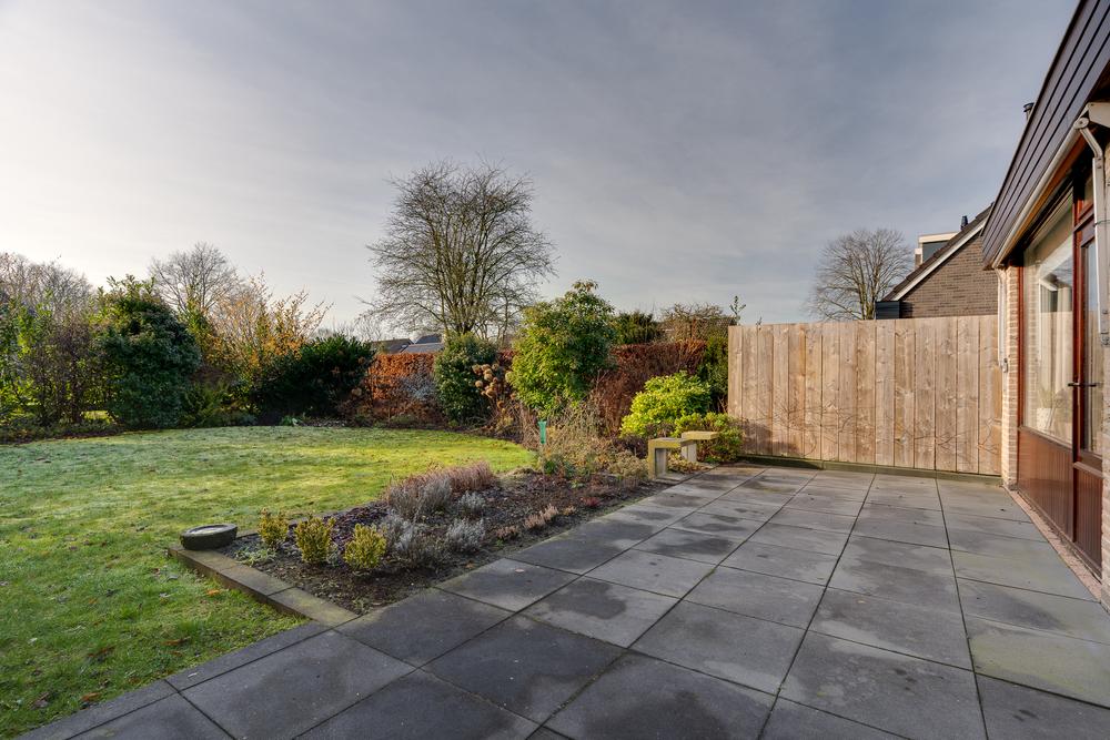 De achtertuin is diep, groen en besloten. Het grote terras sluit aan op het huis, verderop is gras met volwassen beplanting en meerdere zitplekken waar je uit de wind kunt zitten. Voor de woning ligt een flinke oprit met ruimte voor meerdere auto’s en de aangebouwde garage met achterliggende berging maakt het plaatje compleet.