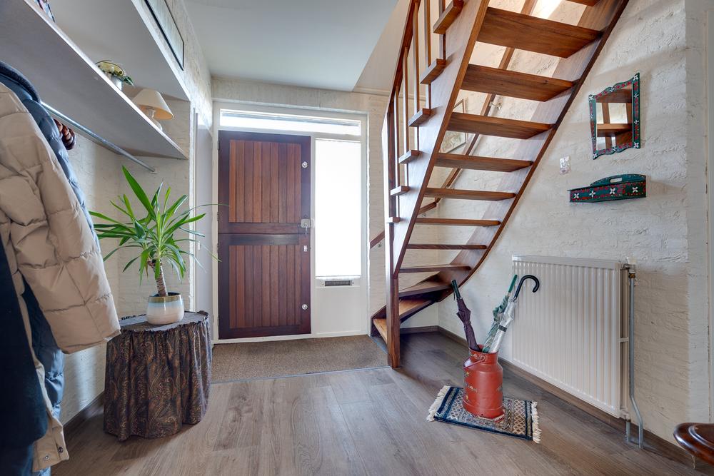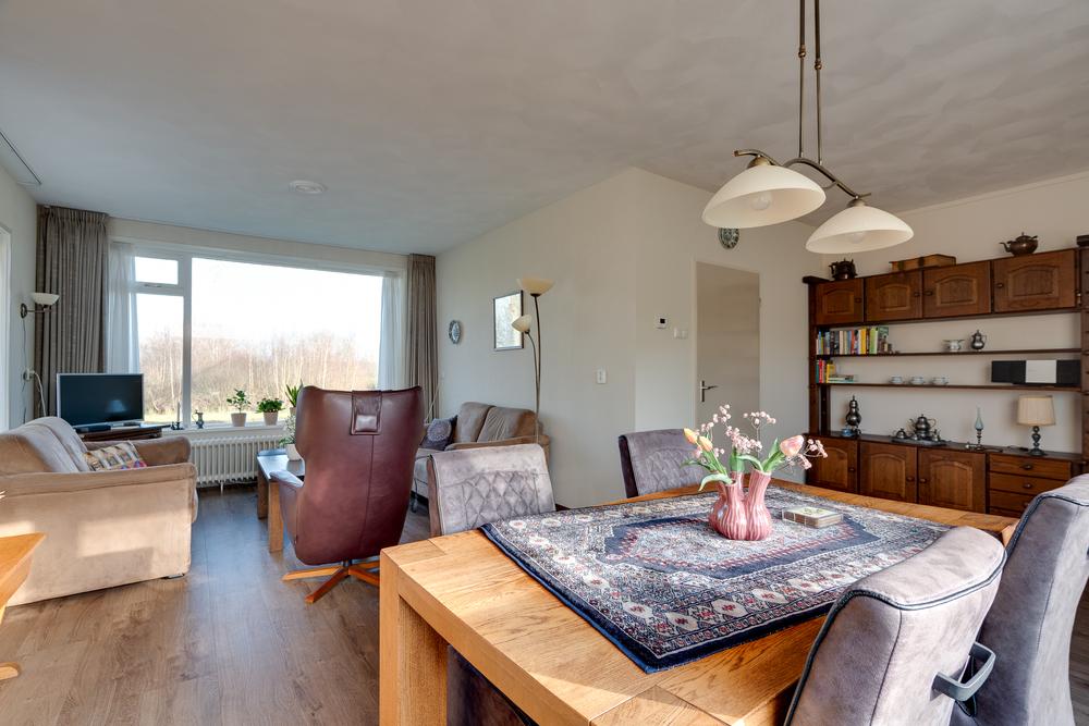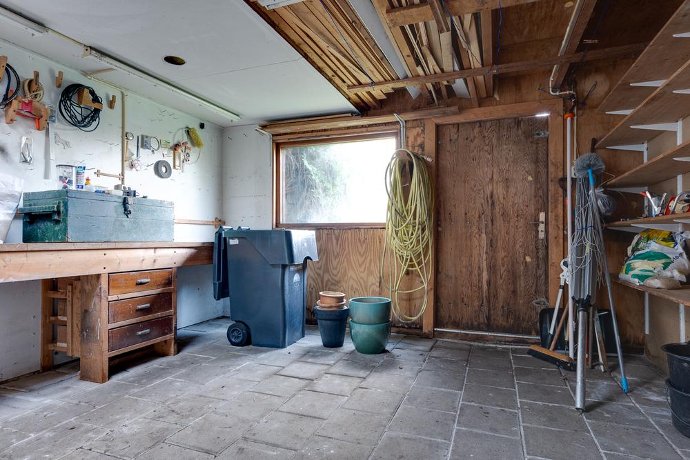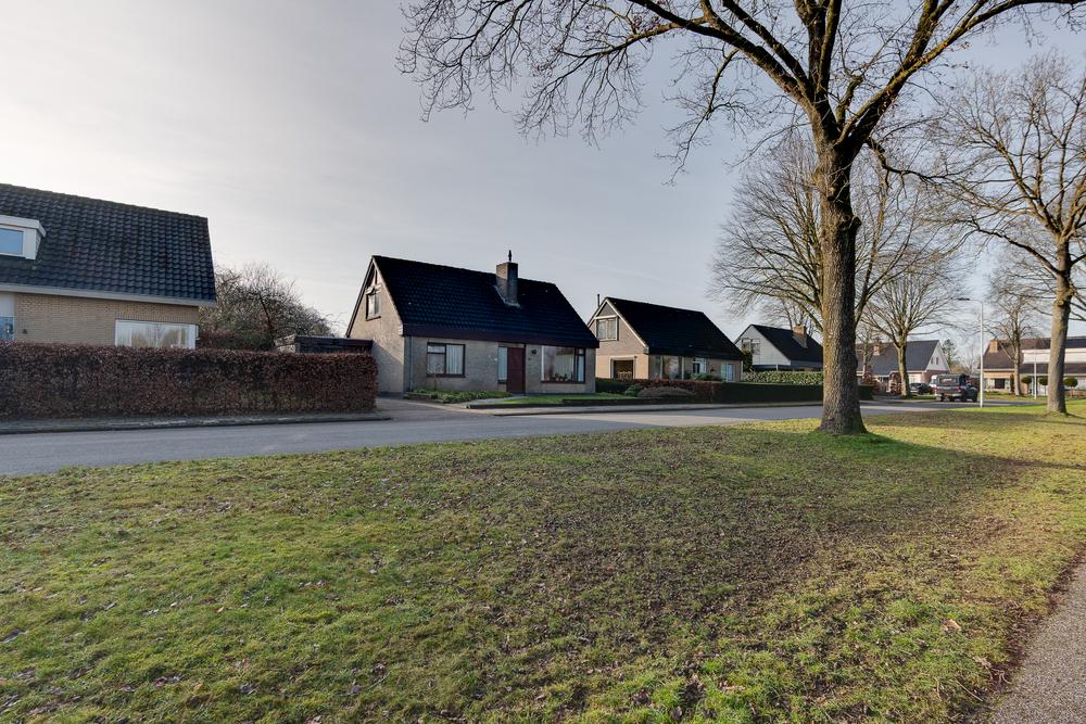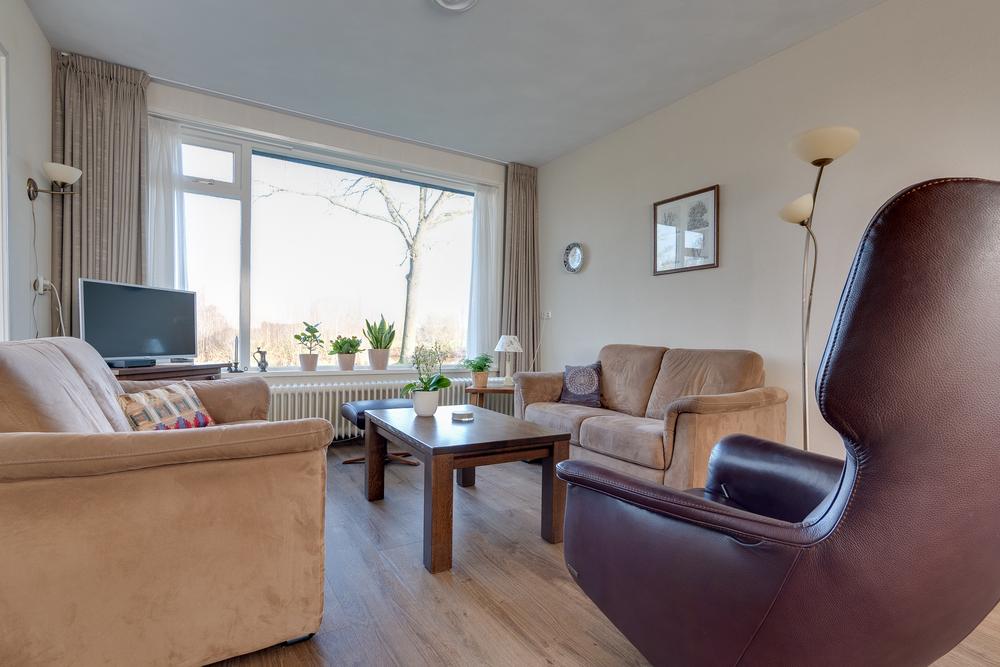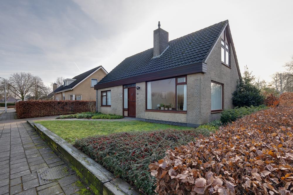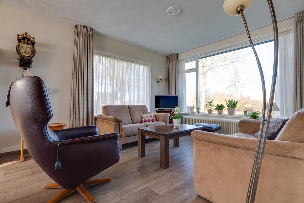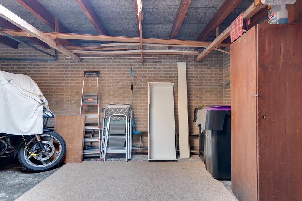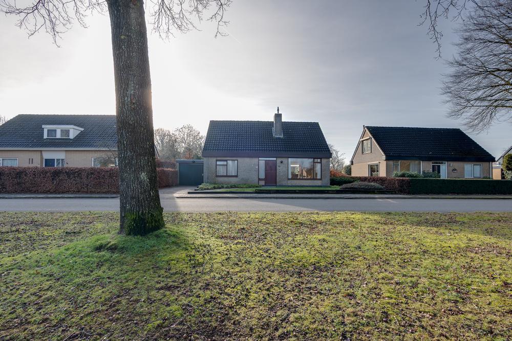 De achtertuin is diep, groen en besloten. Het grote terras sluit aan op het huis, verderop is gras met volwassen beplanting en meerdere zitplekken waar je uit de wind kunt zitten. Voor de woning ligt een flinke oprit met ruimte voor meerdere auto’s en de aangebouwde garage met achterliggende berging maakt het plaatje compleet.