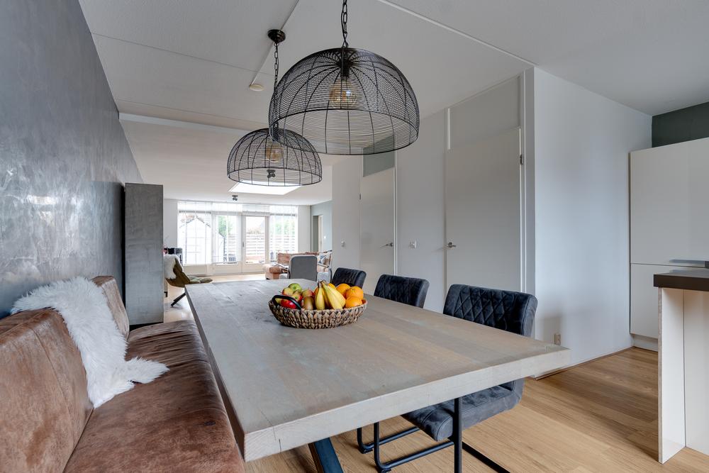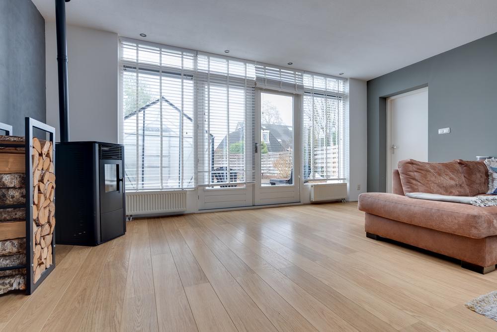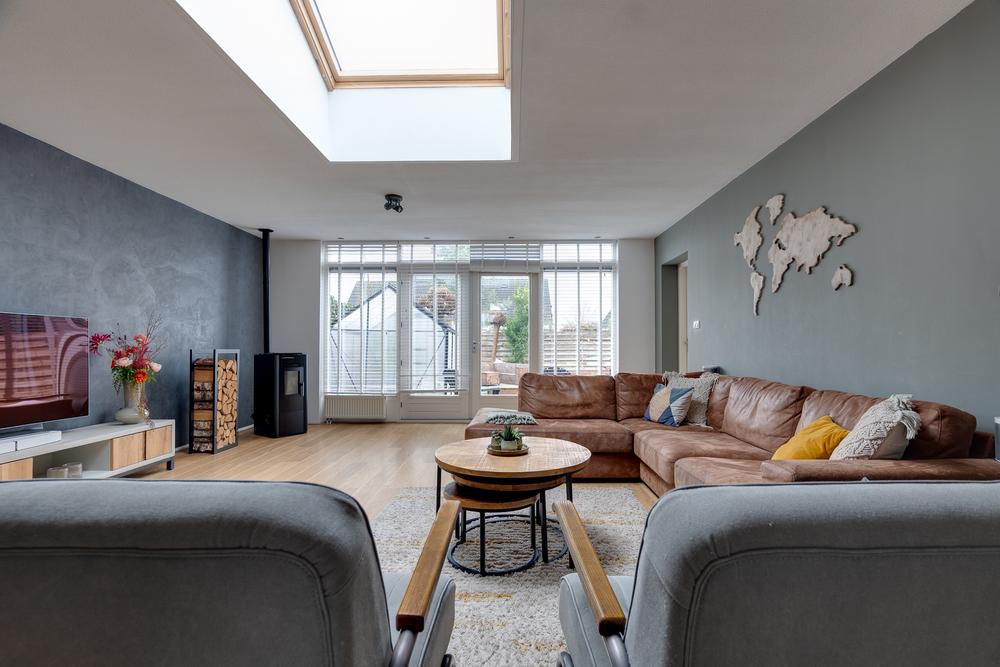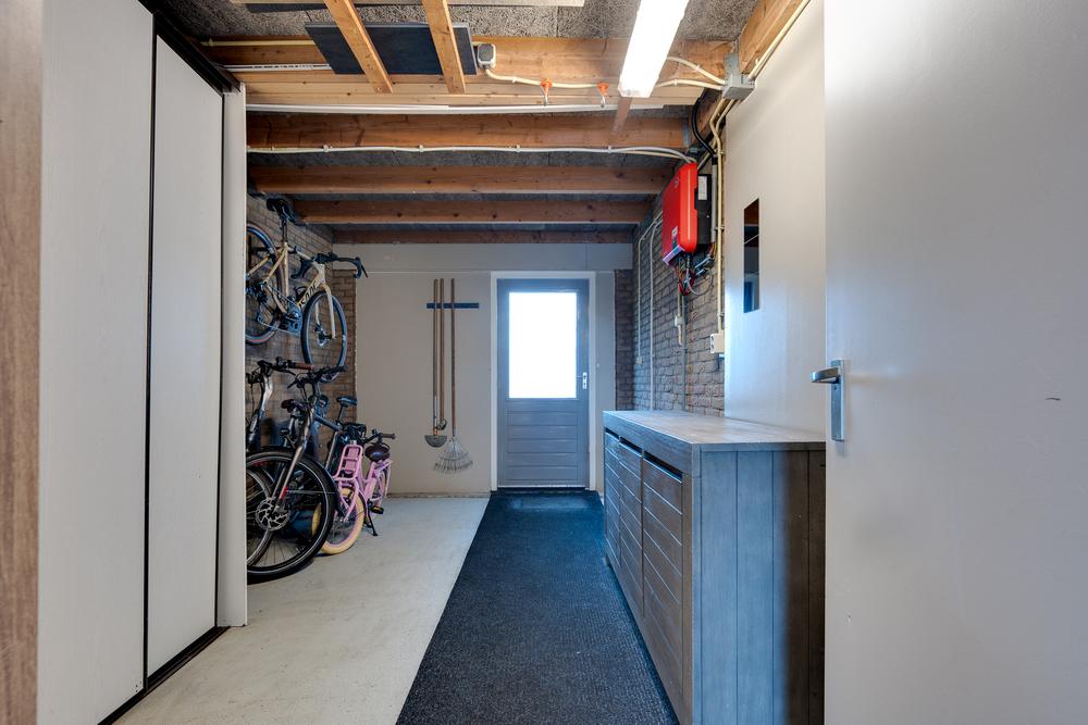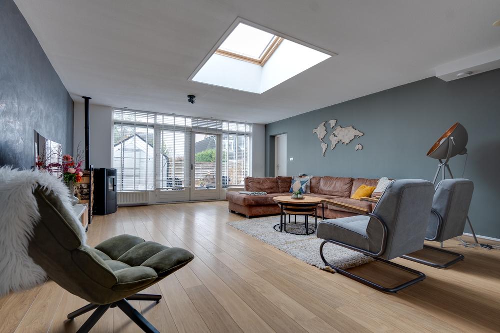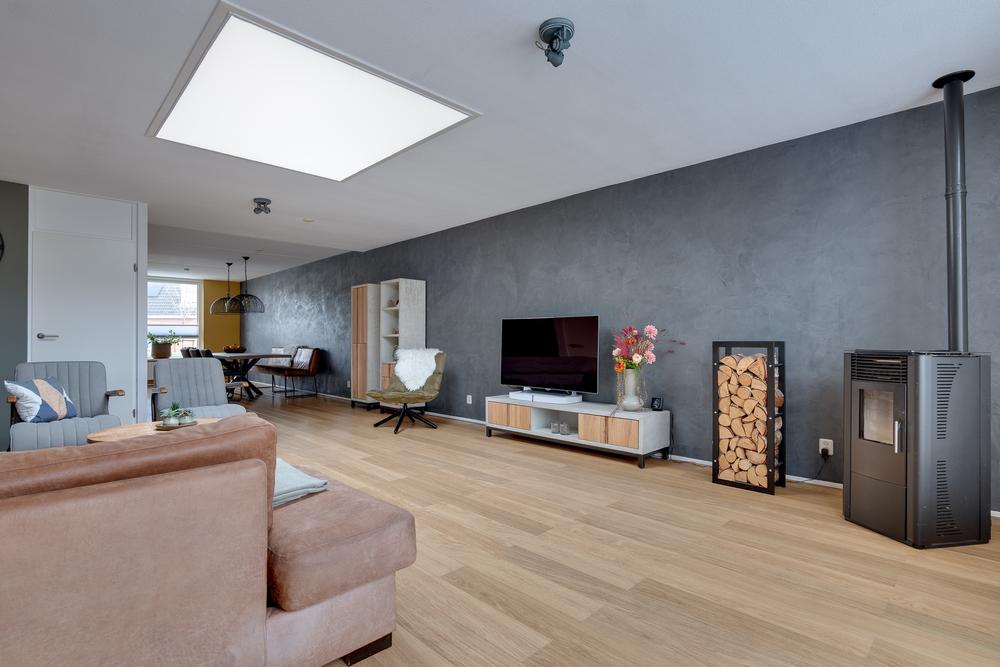 Je komt binnen in een ruime hal met modern toilet en loopt door naar de tuingerichte woonkamer en eetkamer. Samen vormen zij het huiskamerhart van 42 m², met een grote lichtkoepel, een brede pui naar de tuin en een pelletkachel die winteravonden behaaglijk maakt. Aan de straatzijde ligt de open leefkeuken van 18 m² met kookeiland, veel werkblad en inbouwapparatuur, waaronder een combi?oven uit 2022, een vaatwasser uit 2021 en een kokendwaterkraan. Direct aangrenzend vind je de bijkeuken met wasopstelling en extra kastruimte. Via de bijkeuken loop je door naar de aangebouwde garage/berging, ideaal voor fietsen, kinderwagens en hobbyspullen, met daarnaast een brede oprit.