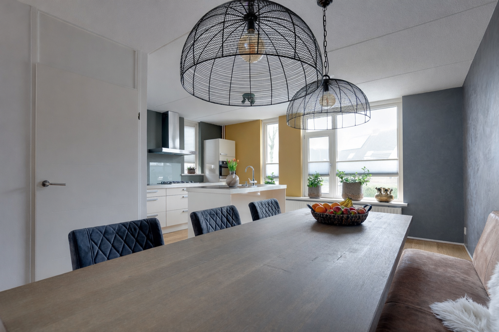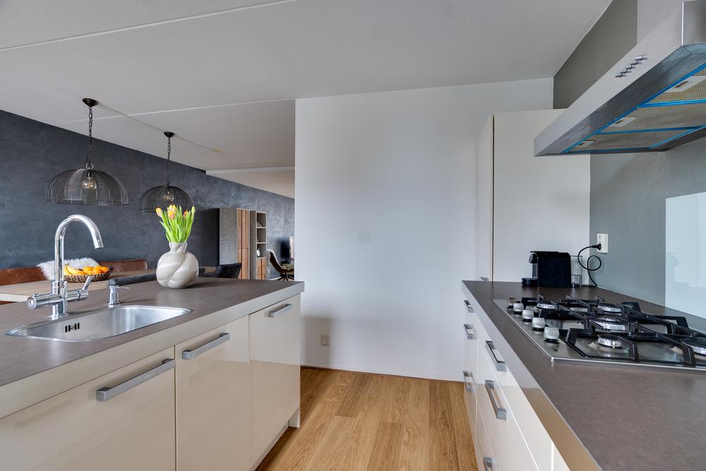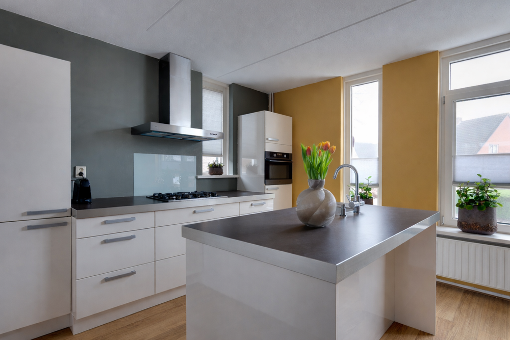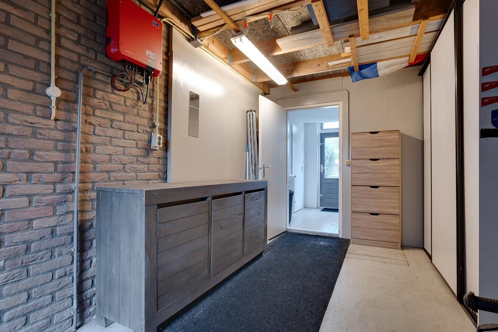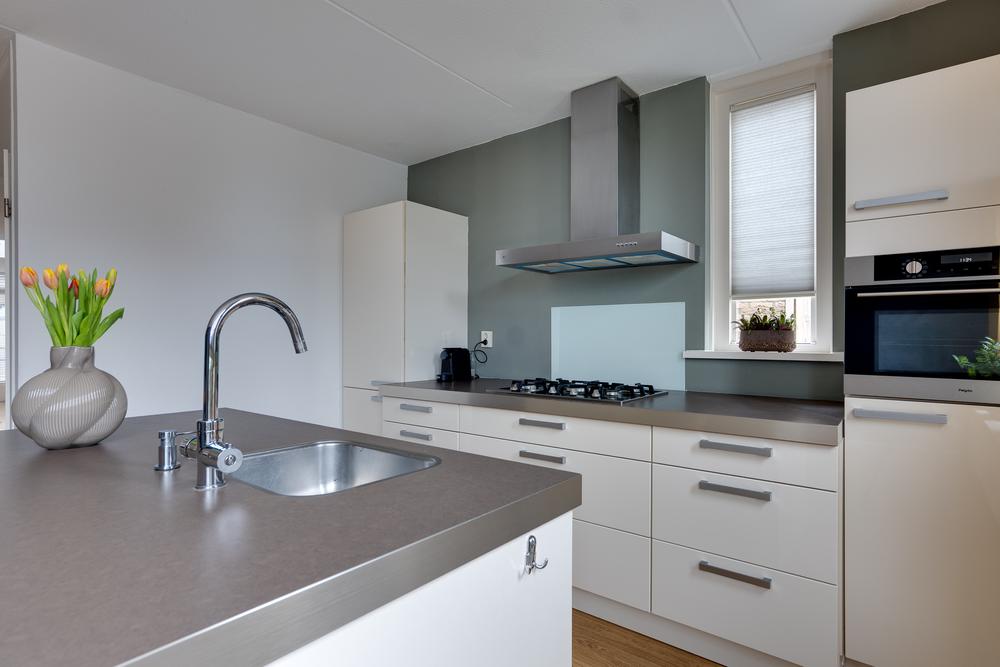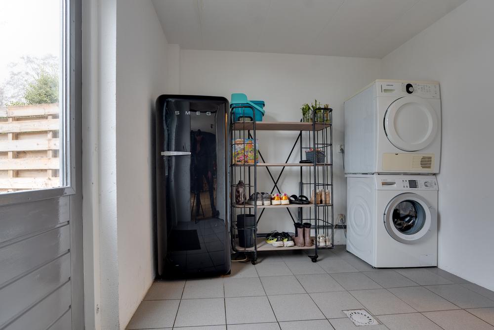Je komt binnen in een ruime hal met modern toilet en loopt door naar de tuingerichte woonkamer en eetkamer. Samen vormen zij het huiskamerhart van 42 m², met een grote lichtkoepel, een brede pui naar de tuin en een pelletkachel die winteravonden behaaglijk maakt. Aan de straatzijde ligt de open leefkeuken van 18 m² met kookeiland, veel werkblad en inbouwapparatuur, waaronder een combi?oven uit 2022, een vaatwasser uit 2021 en een kokendwaterkraan. Direct aangrenzend vind je de bijkeuken met wasopstelling en extra kastruimte. Via de bijkeuken loop je door naar de aangebouwde garage/berging, ideaal voor fietsen, kinderwagens en hobbyspullen, met daarnaast een brede oprit.