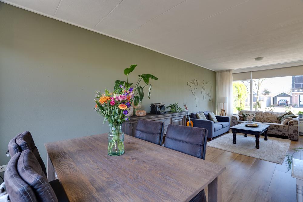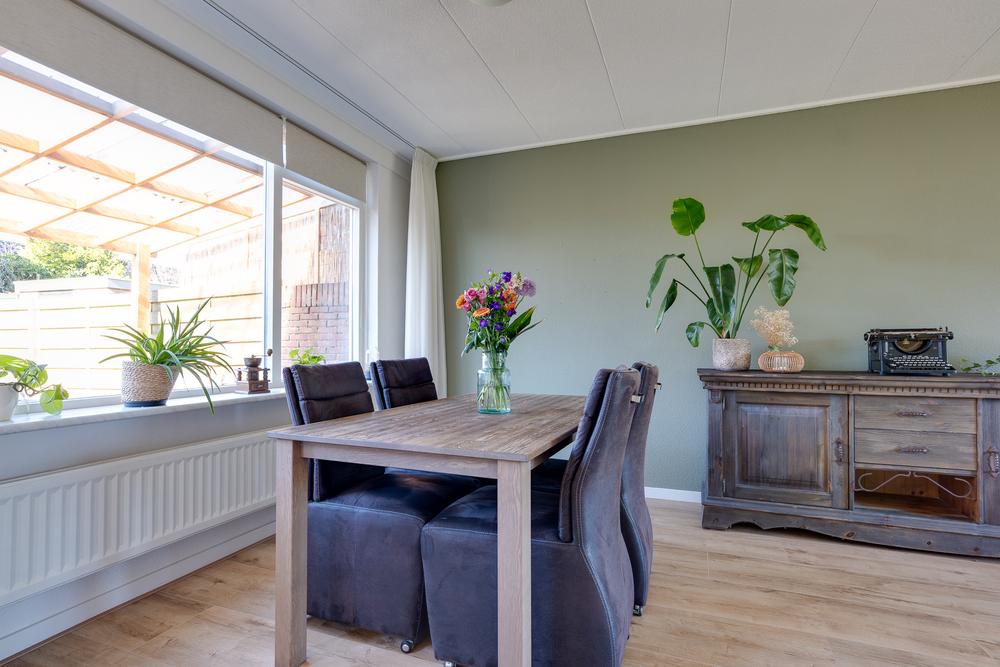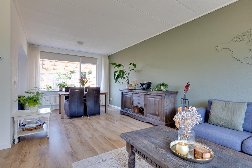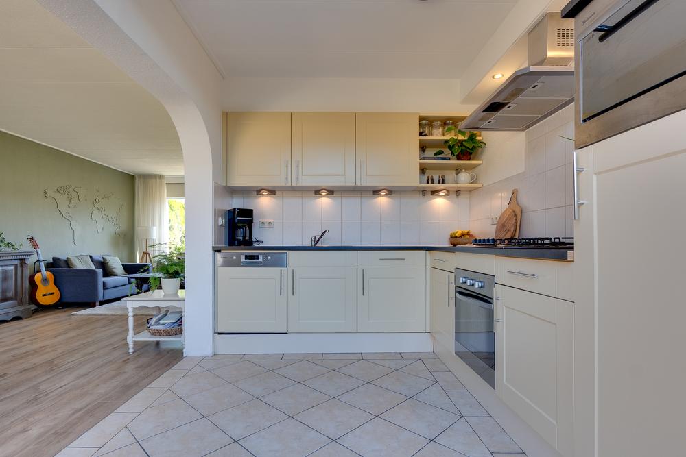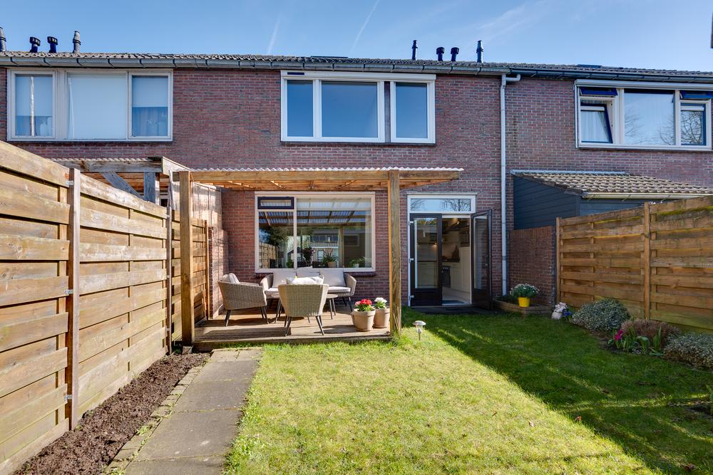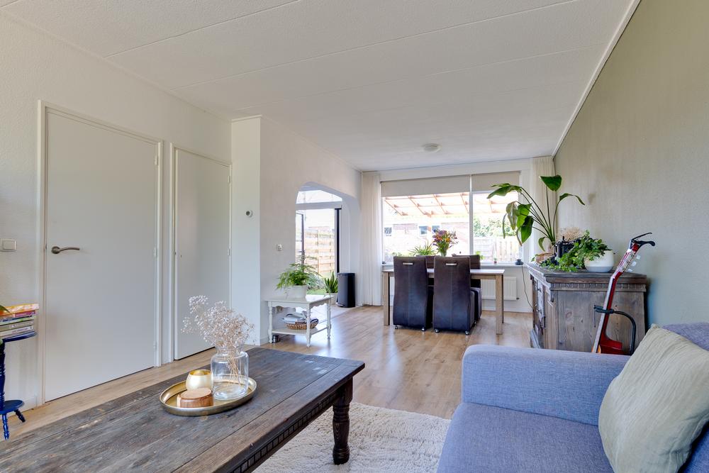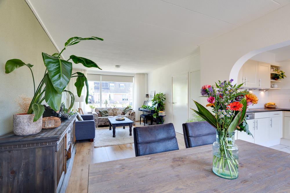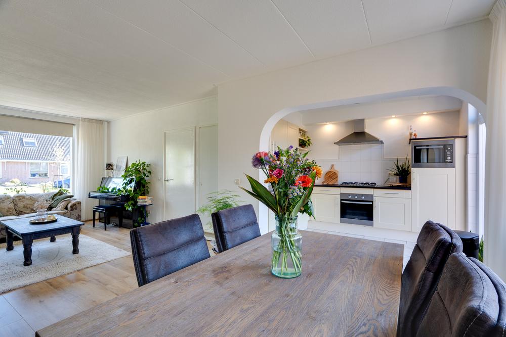 Je komt de woning binnen via de hal met trapopgang en toilet. Vanuit hier loop je door naar de woonkamer van 29 m². Een prettige ruimte waar je eenvoudig een gezellige zithoek en eethoek kunt creëren. Dankzij de grote ramen aan voor- en achterzijde is het hier het hele jaar rond heerlijk licht. De woonkamer heeft een open verbinding met de keuken. Deze keuken biedt dankzij de hoekopstelling ruimte in overvloed en beschikt over onder meer een vaatwasser, oven, combimagnetron en een koelkast. Vanuit de keuken stap je eenvoudig de tuin in, waar je altijd overdekt kunt zitten dankzij de grote overkapping van 11 m². Een fijne plek waar je al snel gebruik van maakt, of het nu gaat om een kop koffie in de ochtendzon of een lange zomeravond buiten.