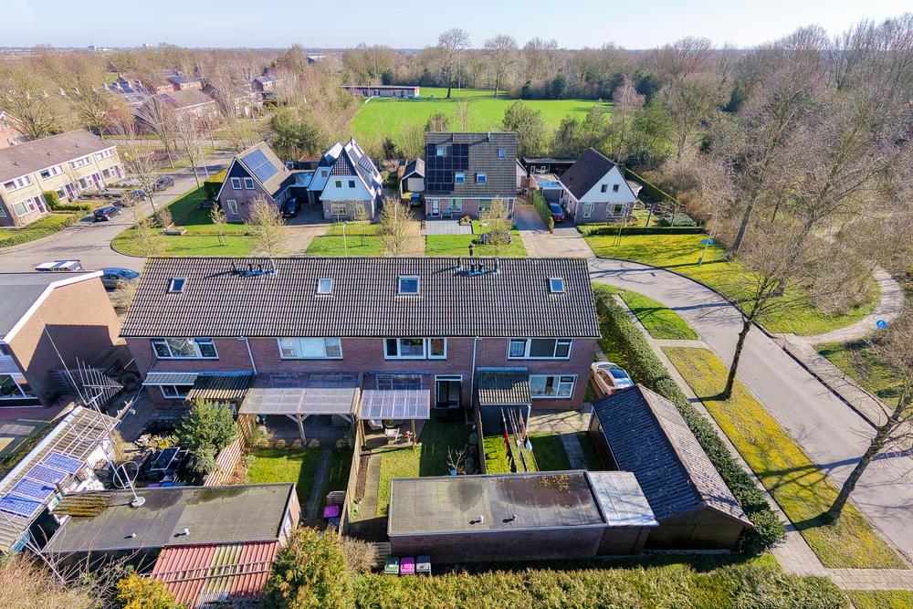 In de tuin staat een vrijstaande schuur van 9 m², handig voor fietsen en opslag. De tuin zelf is overzichtelijk en biedt voldoende ruimte om buiten te zitten en te genieten, zonder dat het veel onderhoud vraagt. Dankzij een handige achterom ben je zo met je fietsen of containers bij de weg.